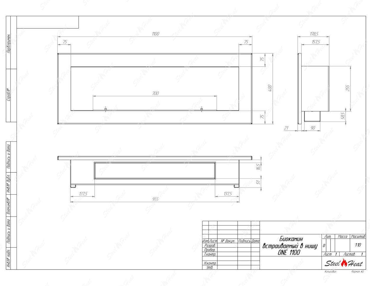 Встраиваемый Биокамин SteelHeat ONE-V 1100 предназначен для встраивания в глухие ниши из гипсокартона, кирпича, пеноблоков, бетона.