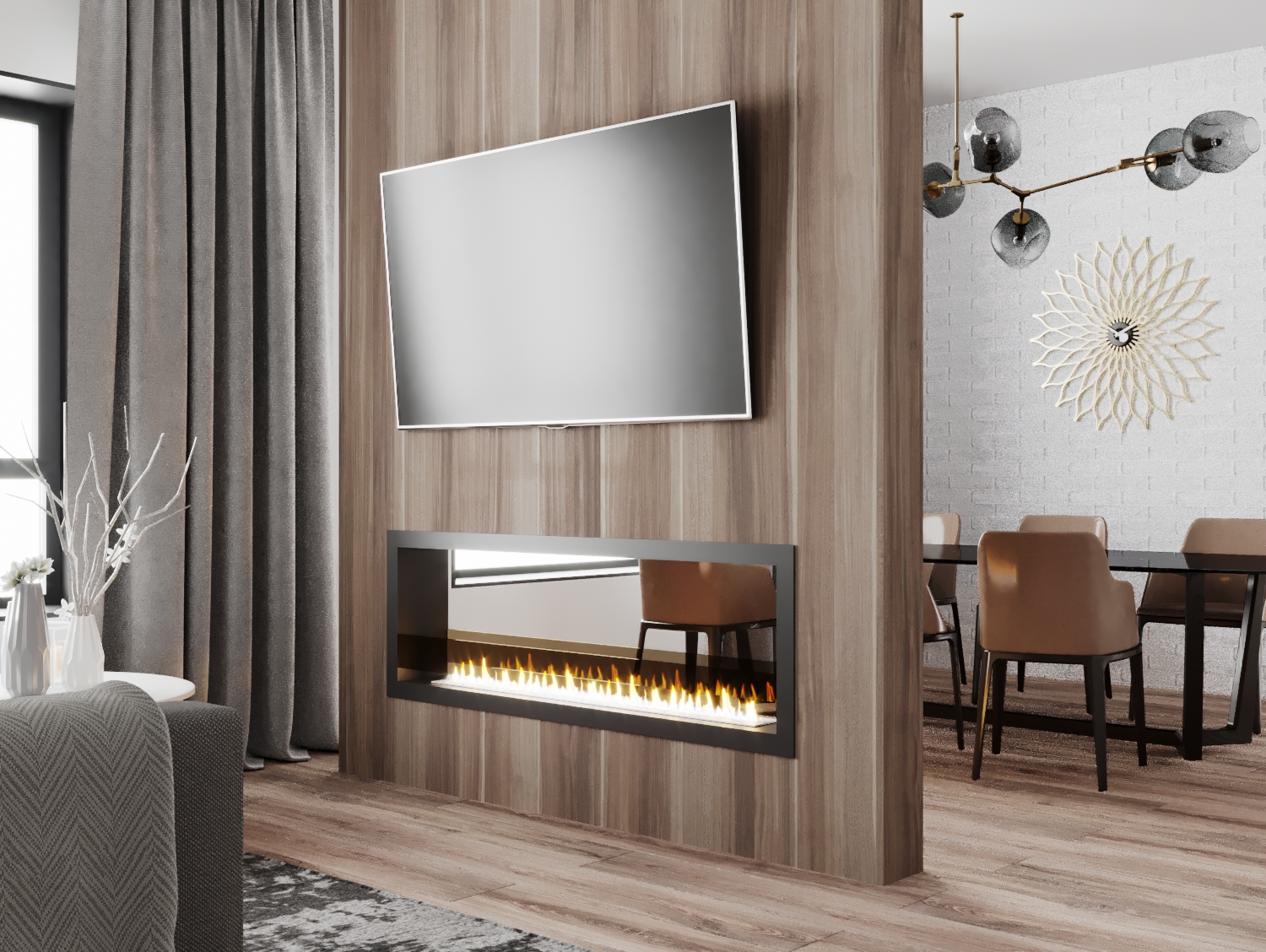 Встраиваемые варианты разделяются на такие как классические, устанавливаемые в подготовленное отверстие в стене или нише. Угловые, которые монтируются в угловую часть стены. Торцевые – открытые с трёх сторон. И сквозные, вид живого огня которых доступен в разных комнатах.