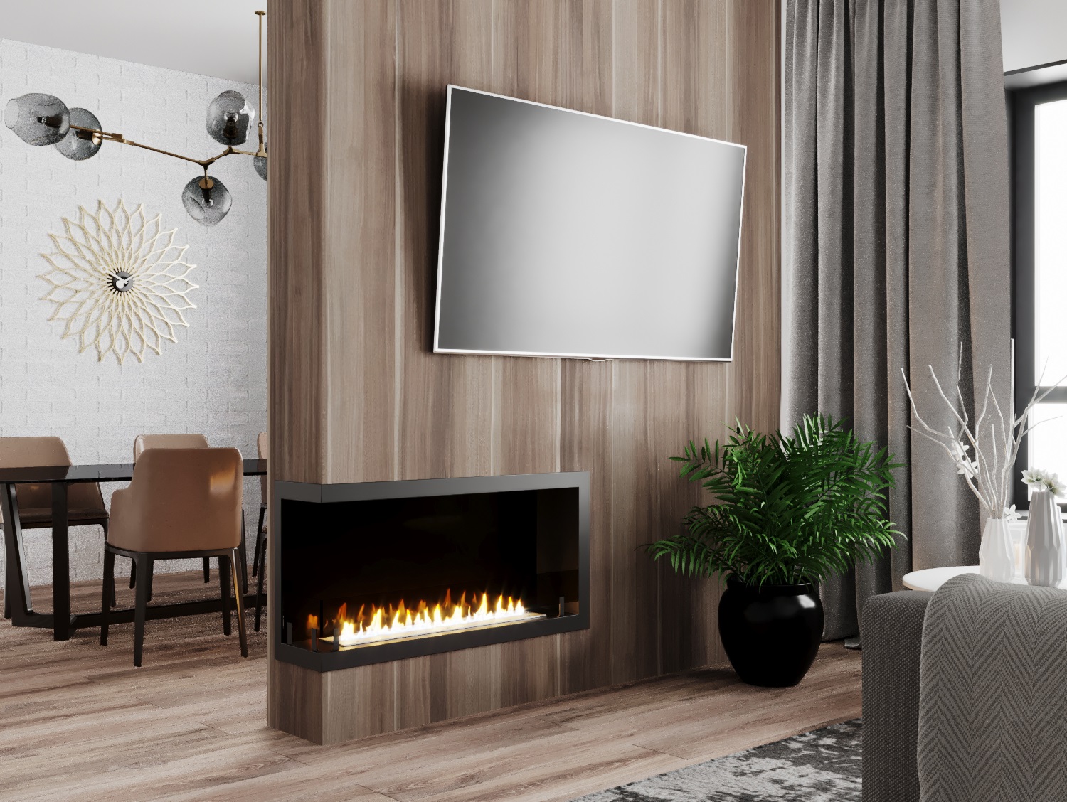 Встраиваемые варианты разделяются на такие как классические, устанавливаемые в подготовленное отверстие в стене или нише. Угловые, которые монтируются в угловую часть стены. Торцевые – открытые с трёх сторон. И сквозные, вид живого огня которых доступен в разных комнатах.