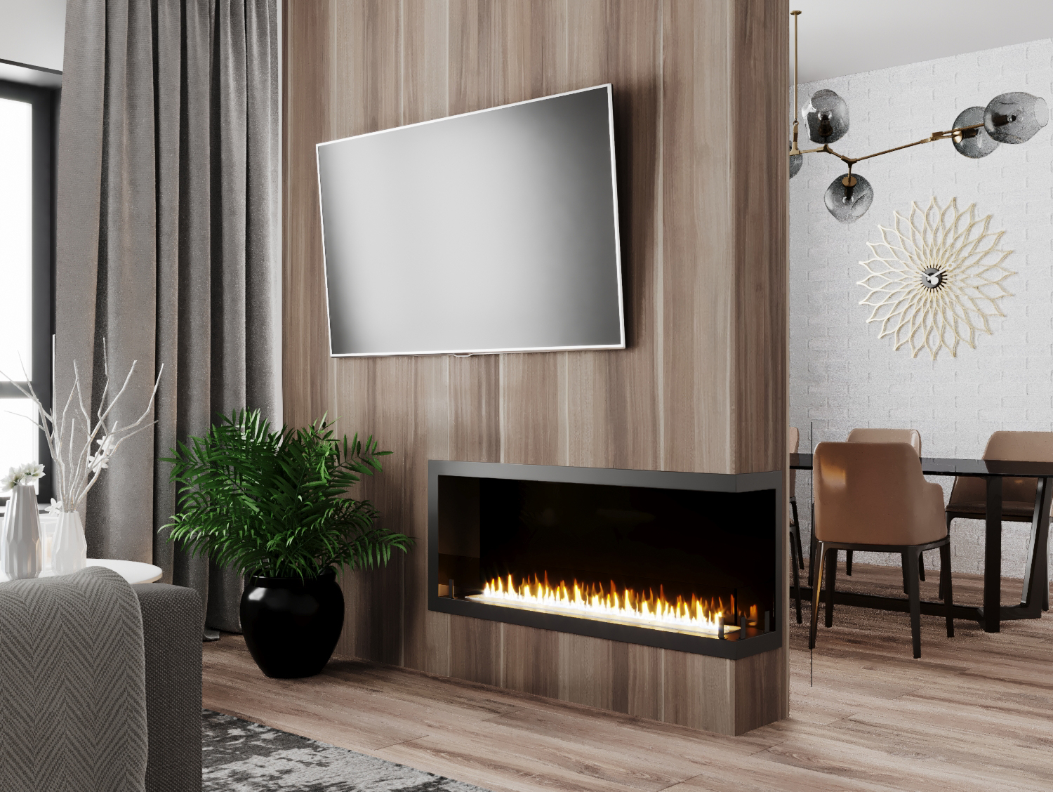 Встраиваемые варианты разделяются на такие как классические, устанавливаемые в подготовленное отверстие в стене или нише. Угловые, которые монтируются в угловую часть стены. Торцевые – открытые с трёх сторон. И сквозные, вид живого огня которых доступен в разных комнатах.