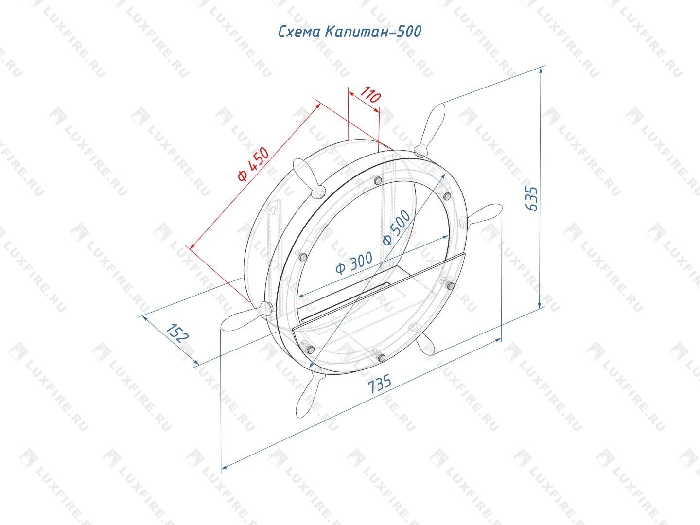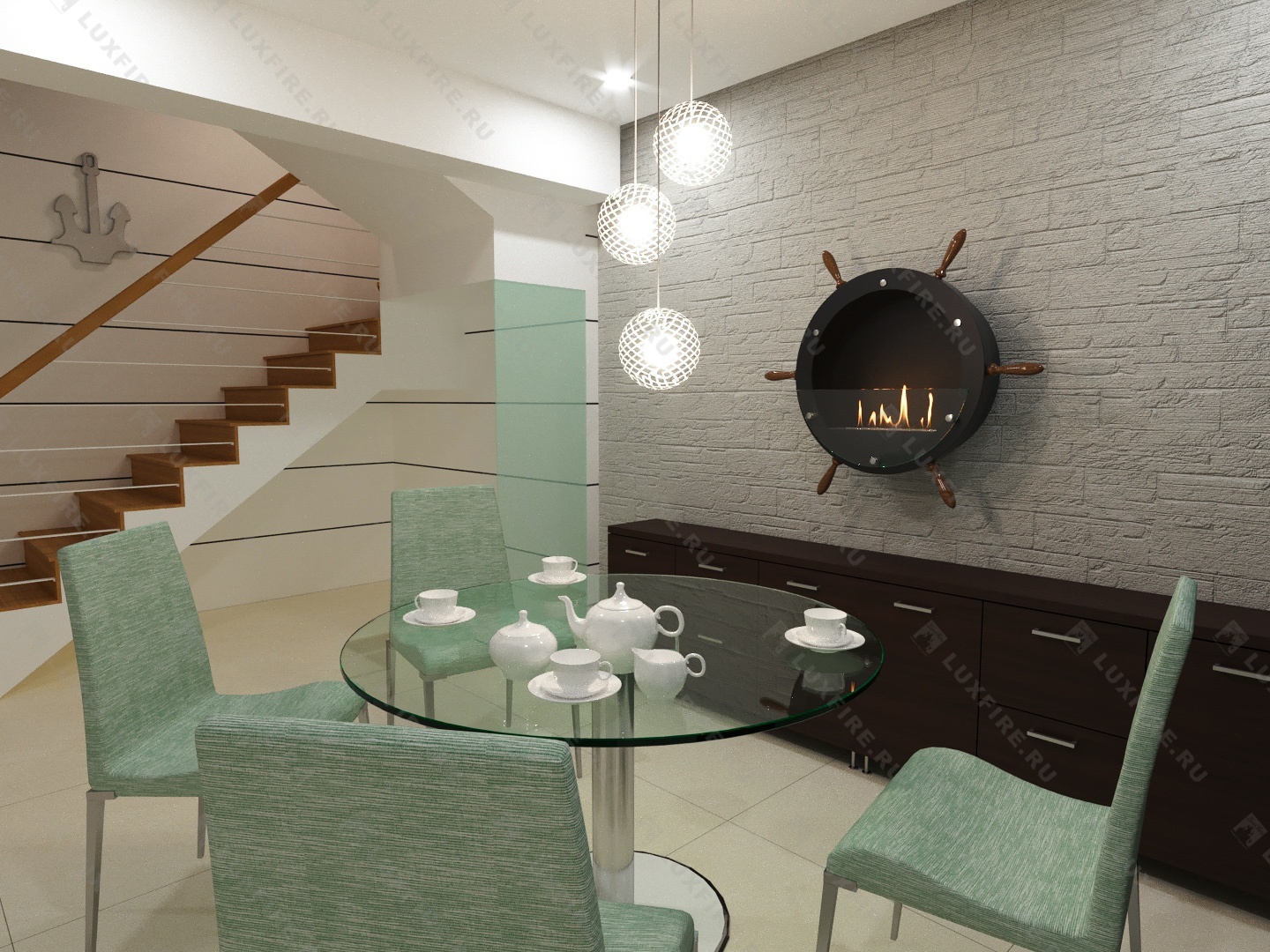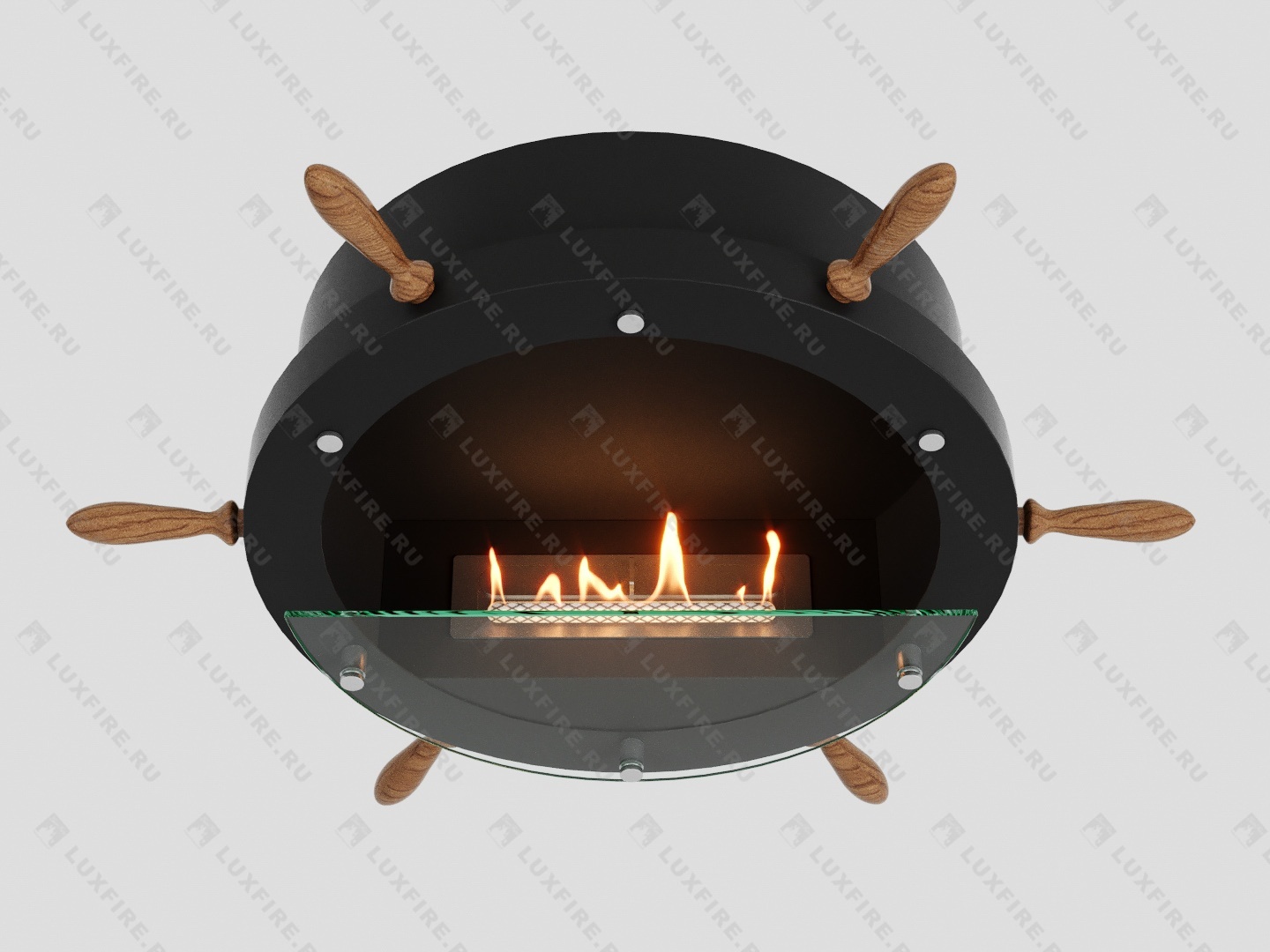 Представляет собой сборную металлическую конструкцию круглой формы класса XS в виде штурвала корабля , создающую полузакрытое безопасное пространство для огня с топливным блоком Lux Fire 250 XS ограниченную закаленным стеклом в котором горит живой огонь с углом обзора 180 градусов . Универсально подходит для встройки в нишу или подвеса на стену.Разработан для квартир, мы рекомендуем установку в комнаты с площадью от 14 м2.