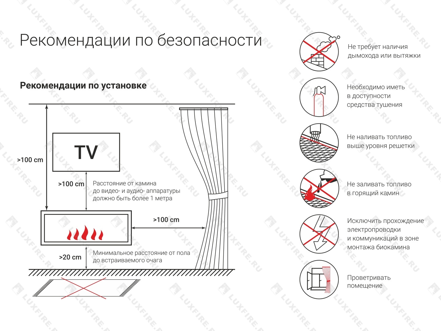 Очаг – это емкость куда заливается жидкое топливо. Емкость внутри заполняется керамическим материалом, который впитывает биотопливо, и в случае опрокидывания камина топливо не разливается. За счет этого конструкция стала полностью пожаробезопасной. Очаг встраивается в корпус из стали, который окрашивается специальной термостойкой краской, или же в заранее подготовленную нишу, изготовленную из негорючих материалов.