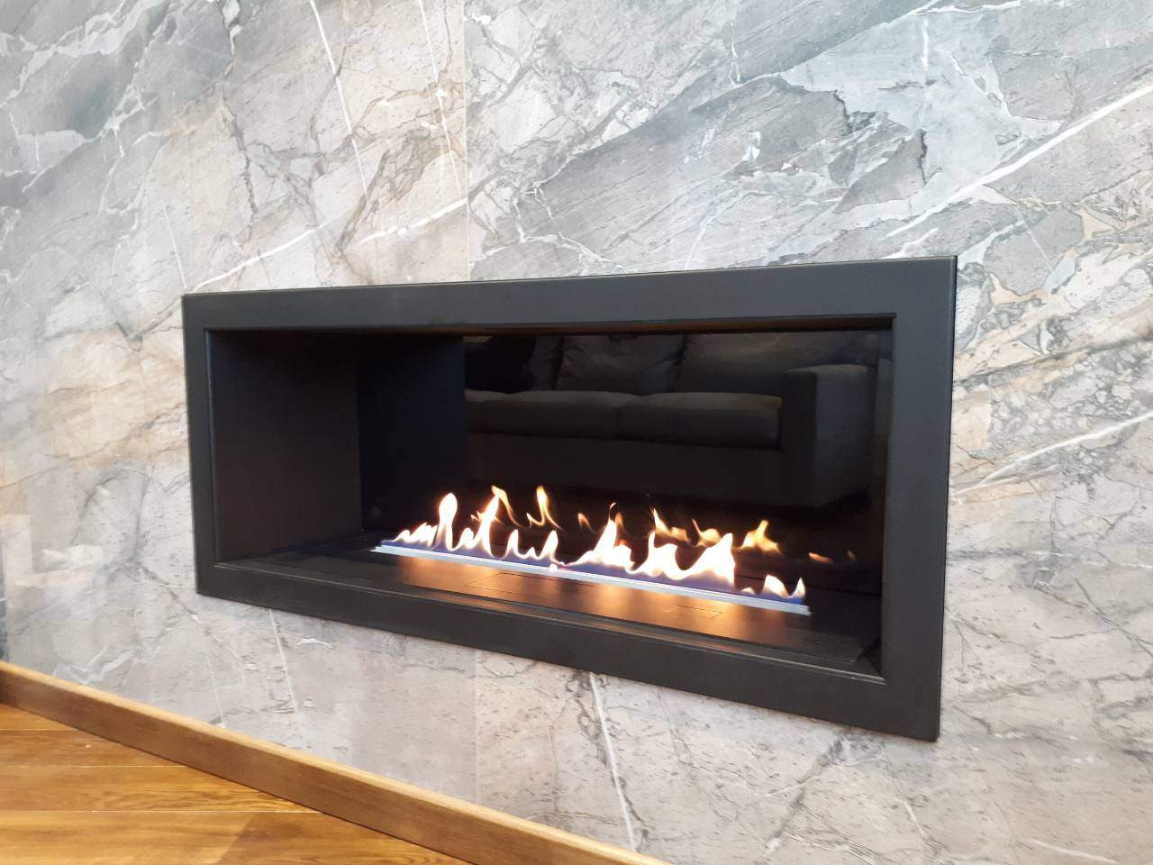Встраиваемый очаг получил идеальные пропорции, единая линия пламени стала протяжённее. Для окрашивания используется огнеупорный порошок. На выбор мы предлагаем установить вам жаростойкое стекло (высотой 10, 12, 15 сантиметров).