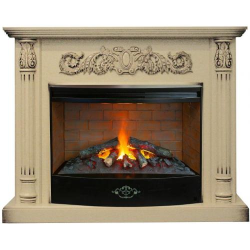Портал выглядит классически строго и шикарно. Передняя часть боковых стенок, обрамляющих очаг, оформлена в виде колонн, по поверхности которых протянуты резные каннелюры. Верхняя часть колонн выполнена в форме резных бутонов. На колонны опирается каминная крышка со ступенчатым карнизом.панель под крышкой оформлена сложным растительным орнаментом. Устанавливается же вся конструкция на невысокое основание.