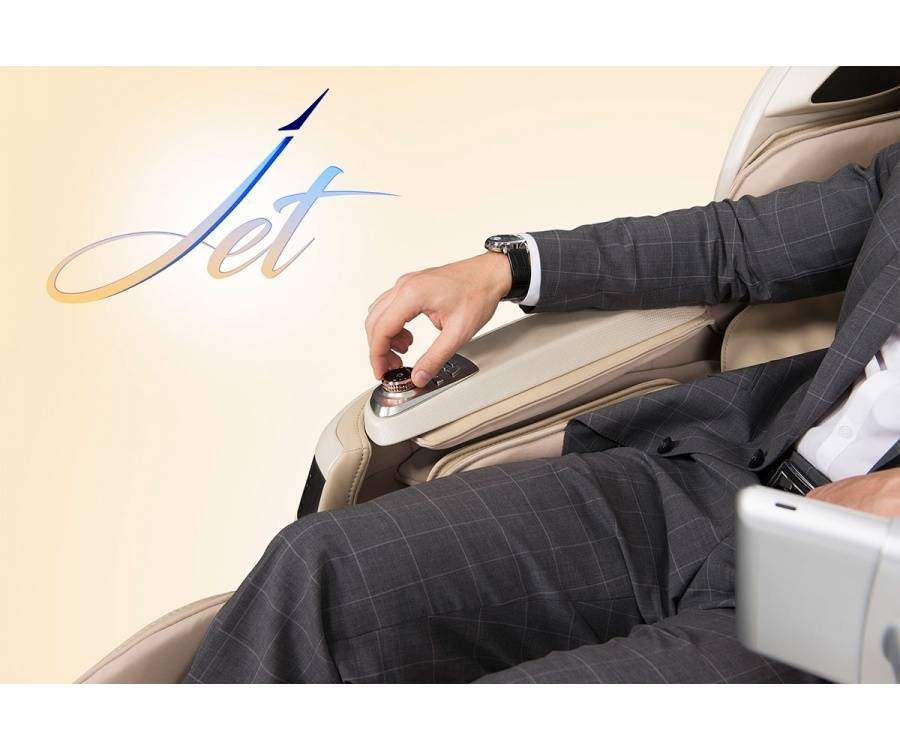 Кресло US Medica Jet пока что единственное в своем роде массажное кресло, оборудованное управляющим джойстиком, который смонтирован на подлокотнике. С его помощью, пользователь одним движением пальца может выбрать автоматическую программу, скорректировать наклон спинки и высоту ножного блока, включить/выключить опцию прогревания и т.д.